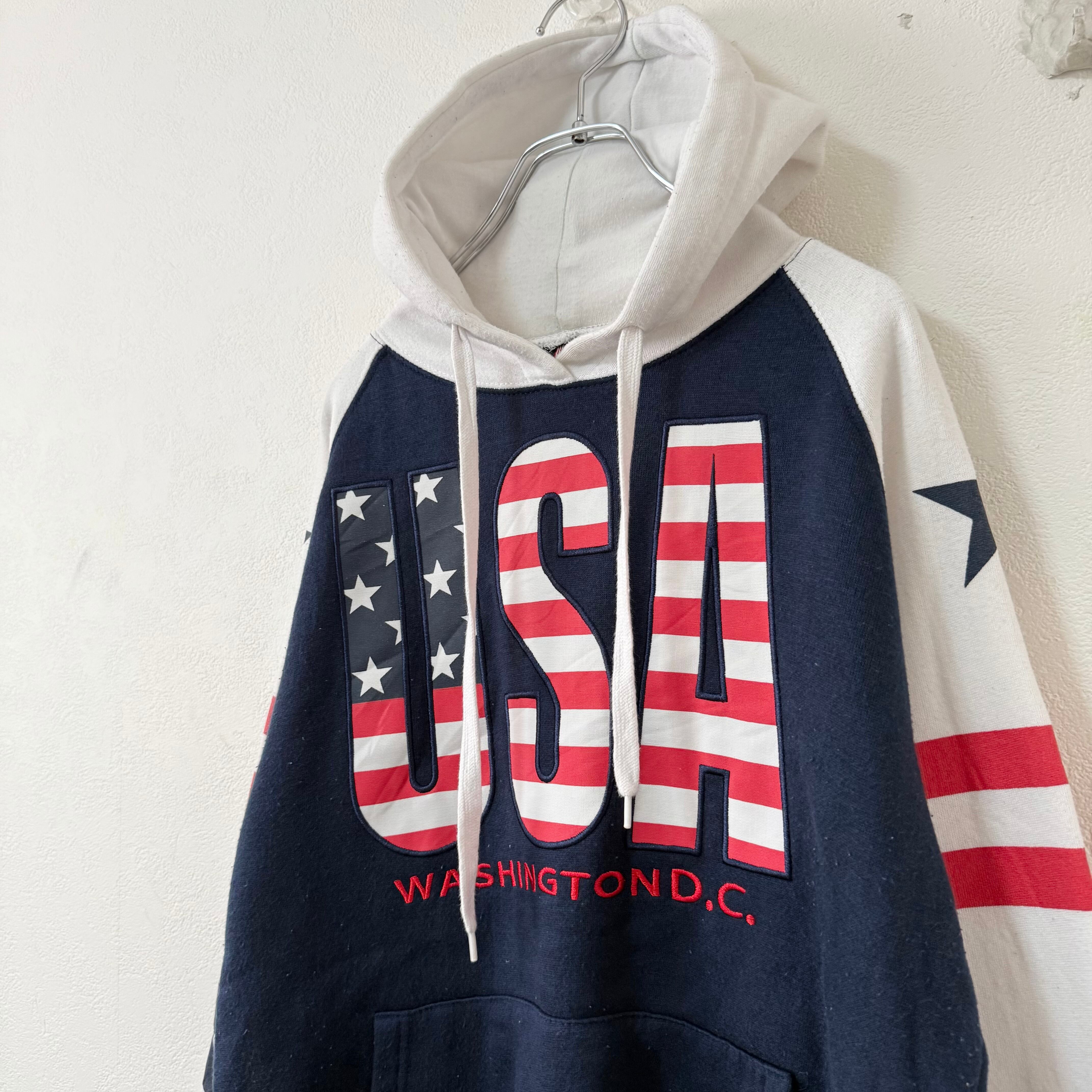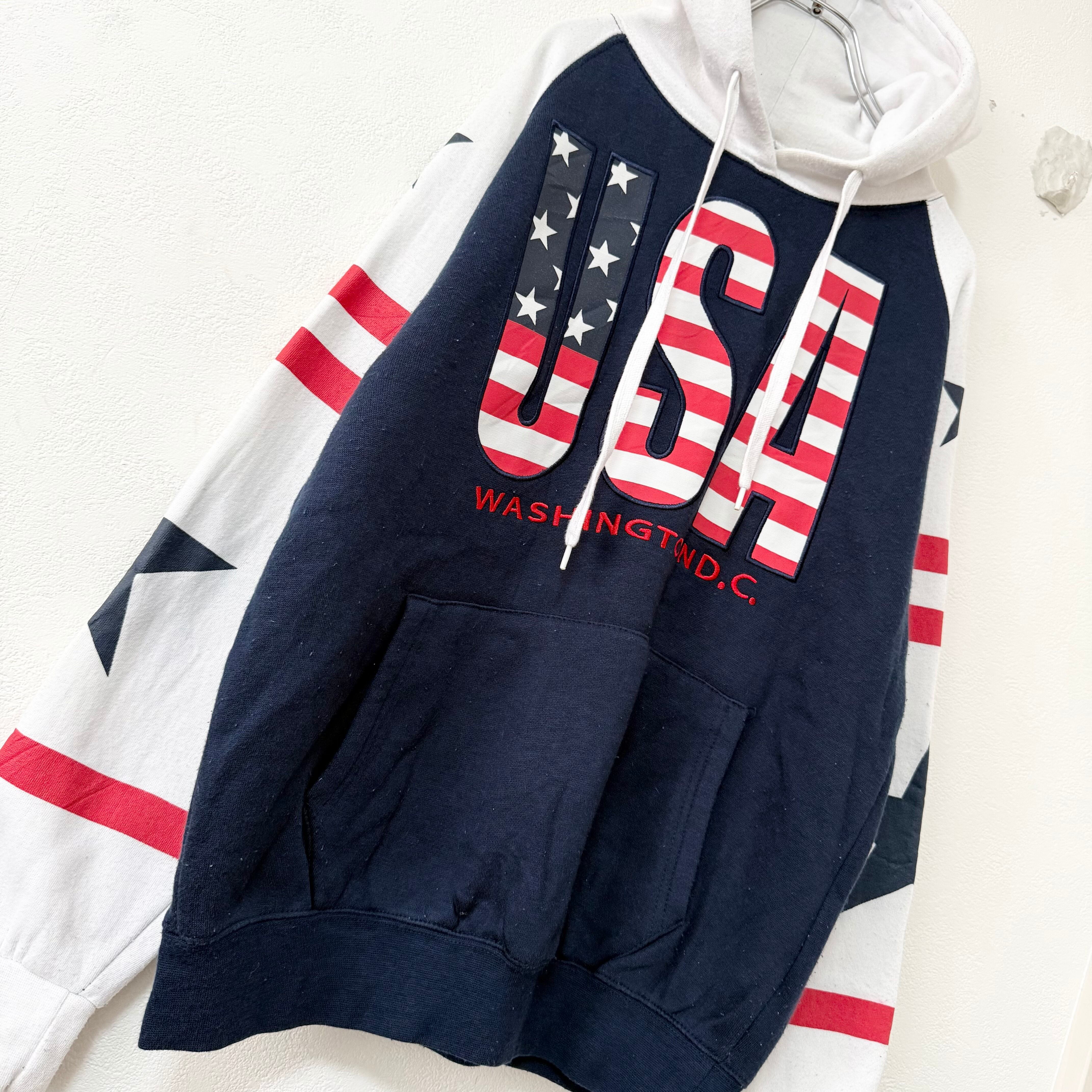 90s★USA製★Vintage★アメリカ国旗★スウェットパーカー★ネイビー/紺×赤×白★M