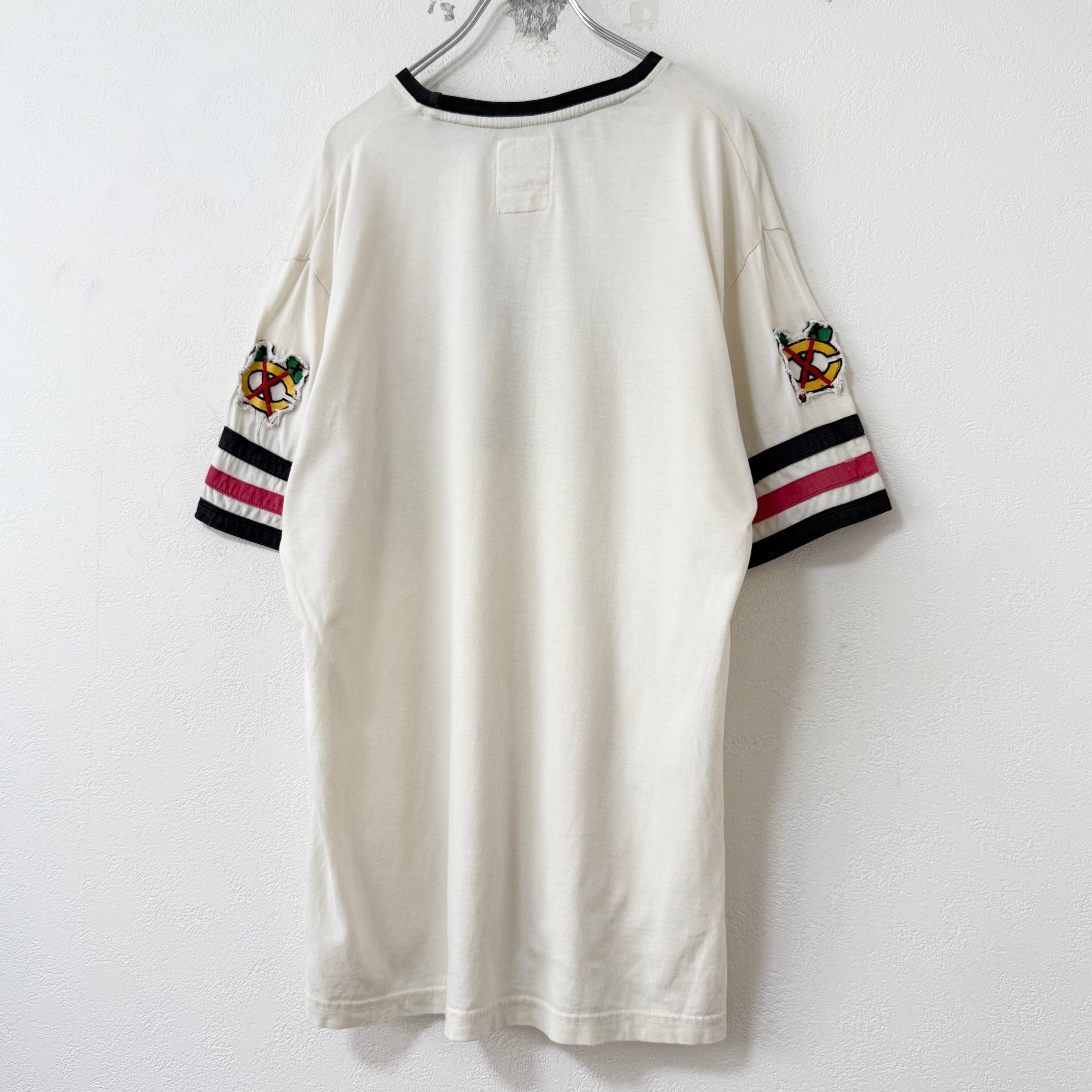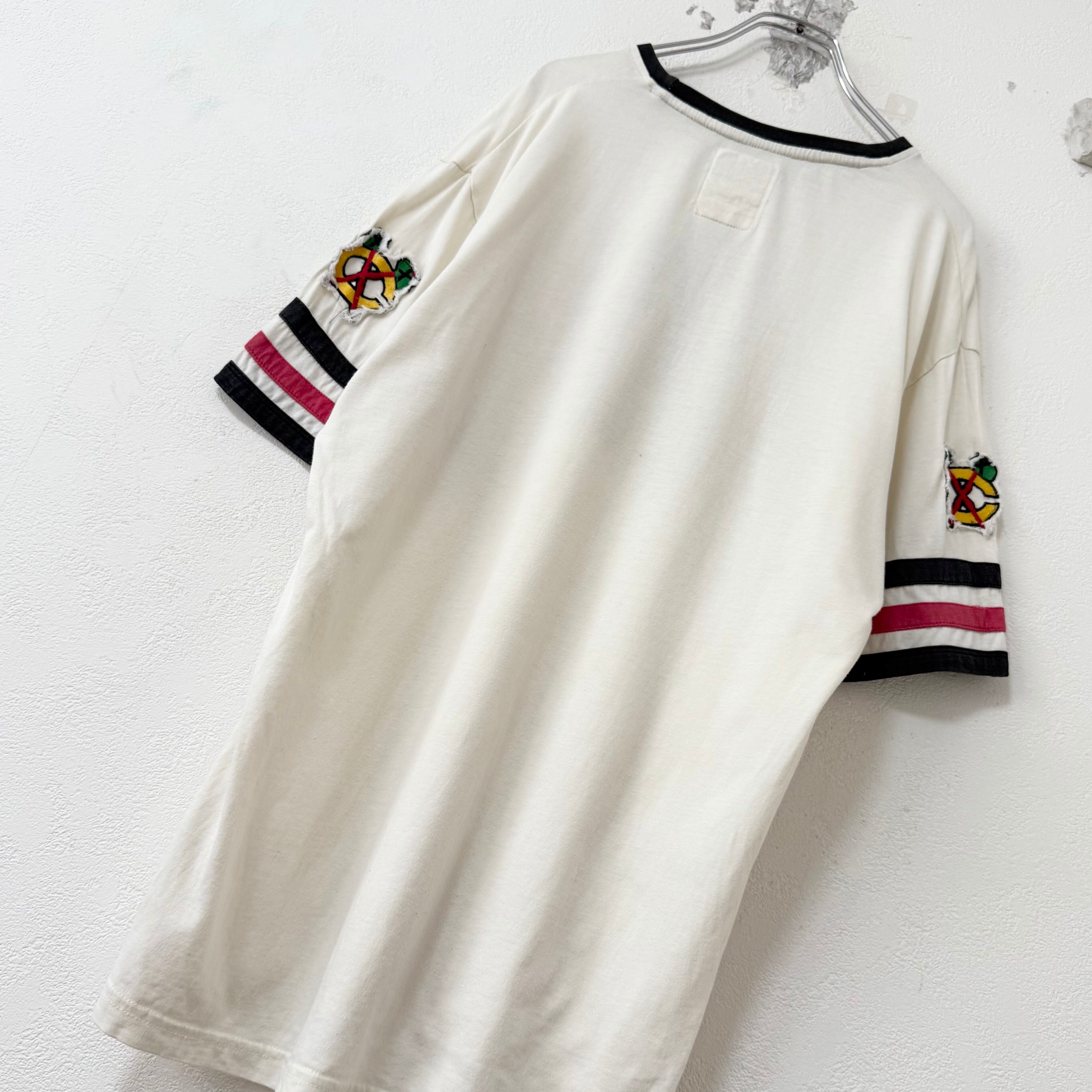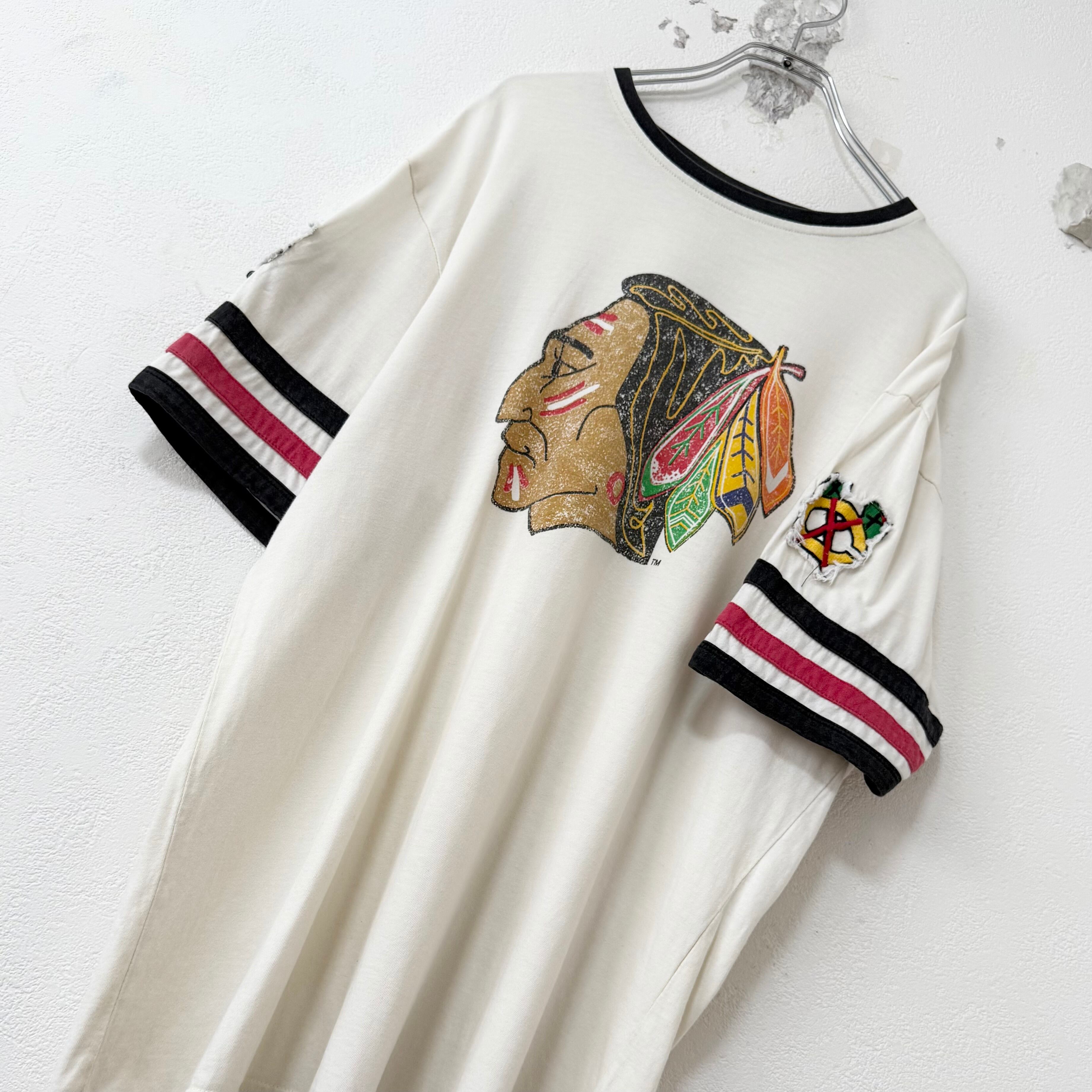90s★ヴィンテージ★NHL★BlackHawks/ブラックホークス★インディアン★半袖リンガーTシャツ★オフホワイト紺赤★M