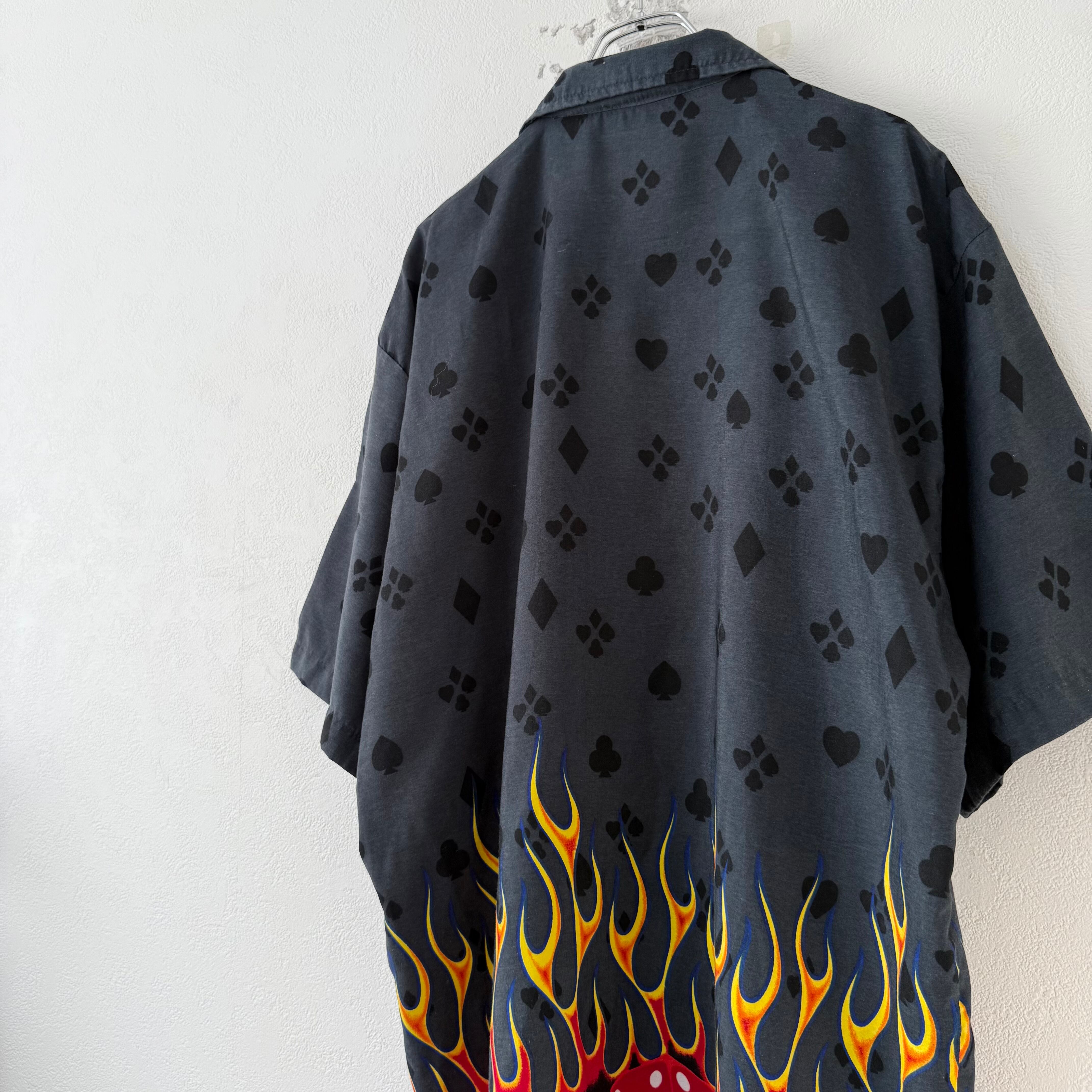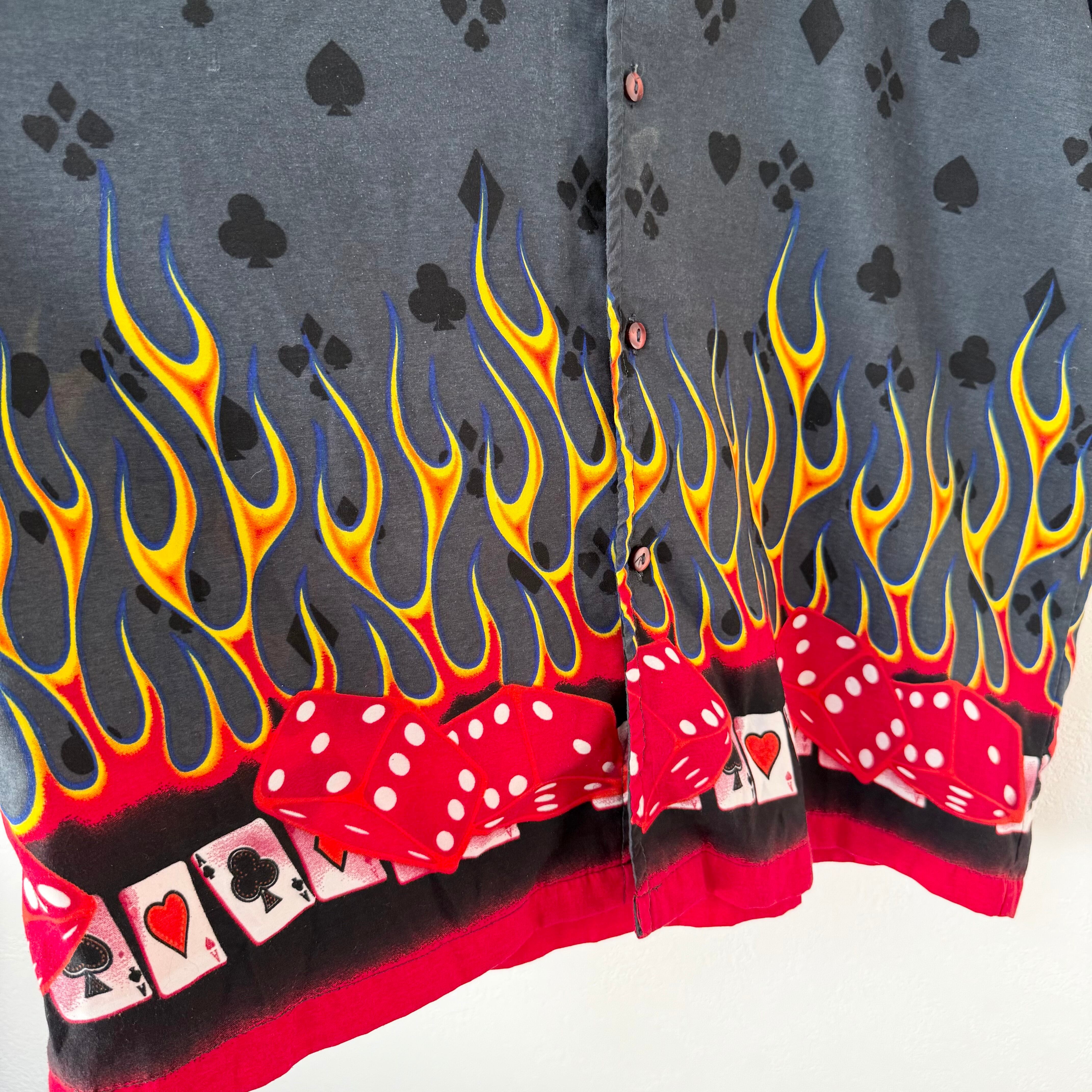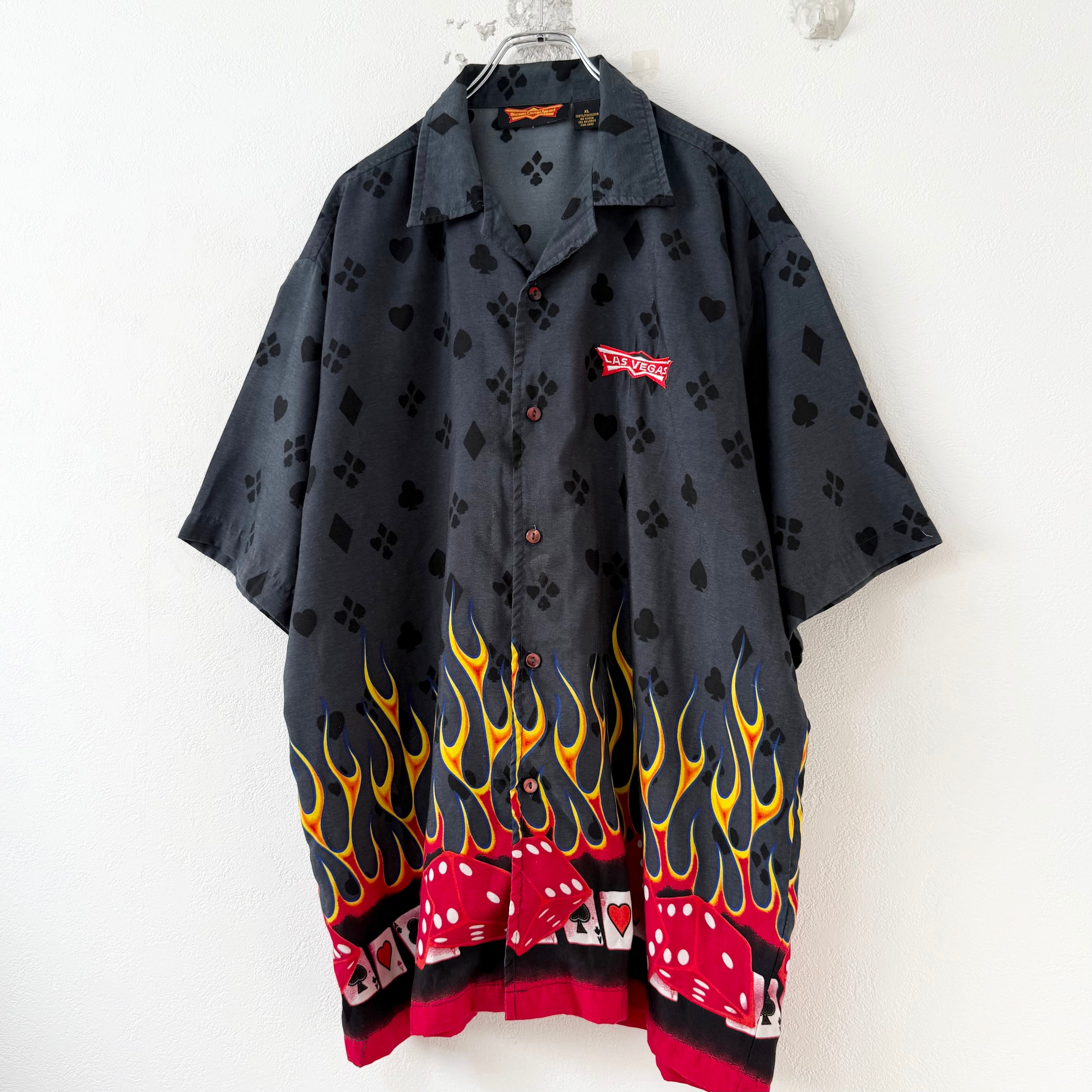 LASVEGAS/ラスベガス★ファイヤー★フレイム★ダイス★トランプ★総柄シャツ★ポリエステル★ブラック/黒赤オレンジ★XL