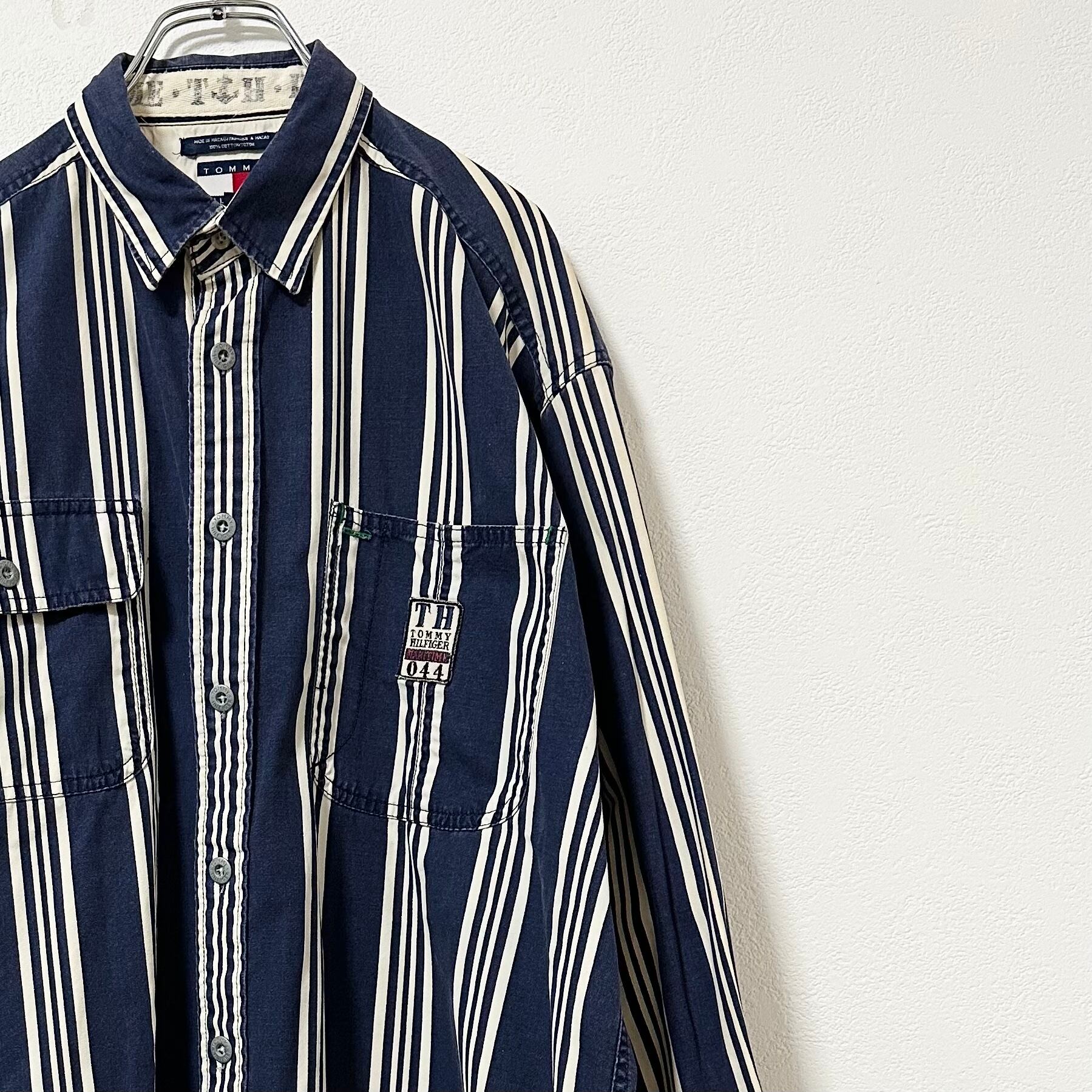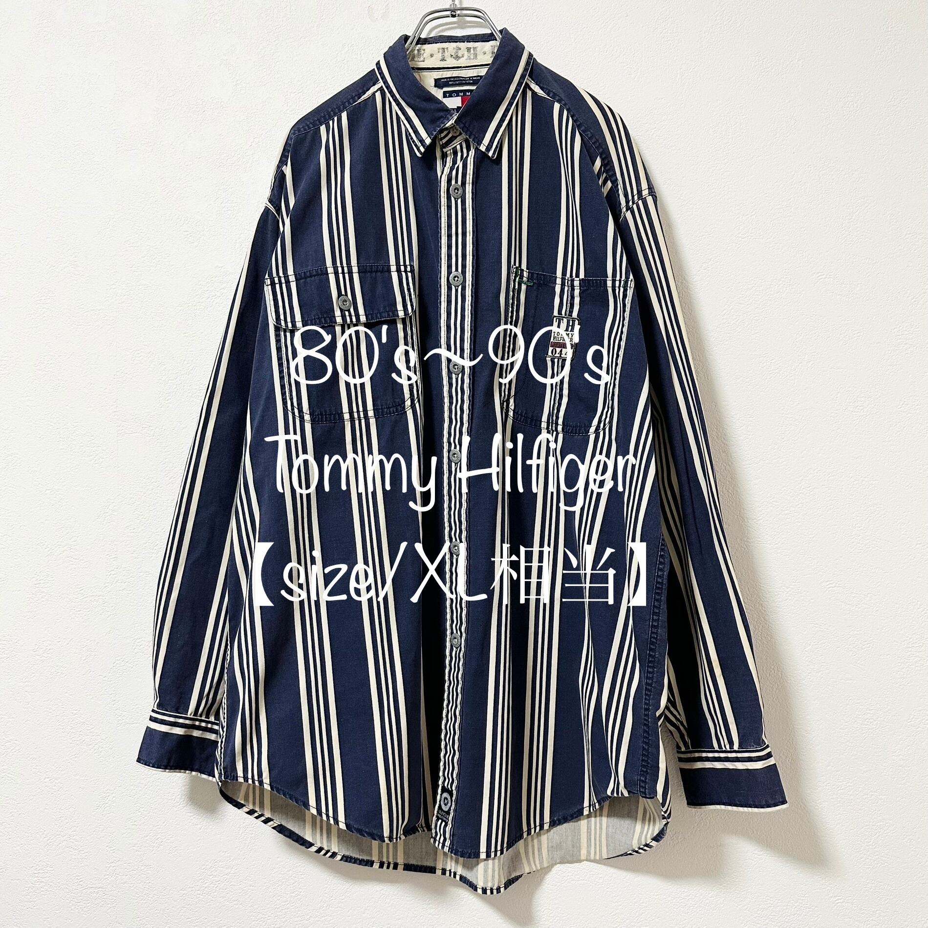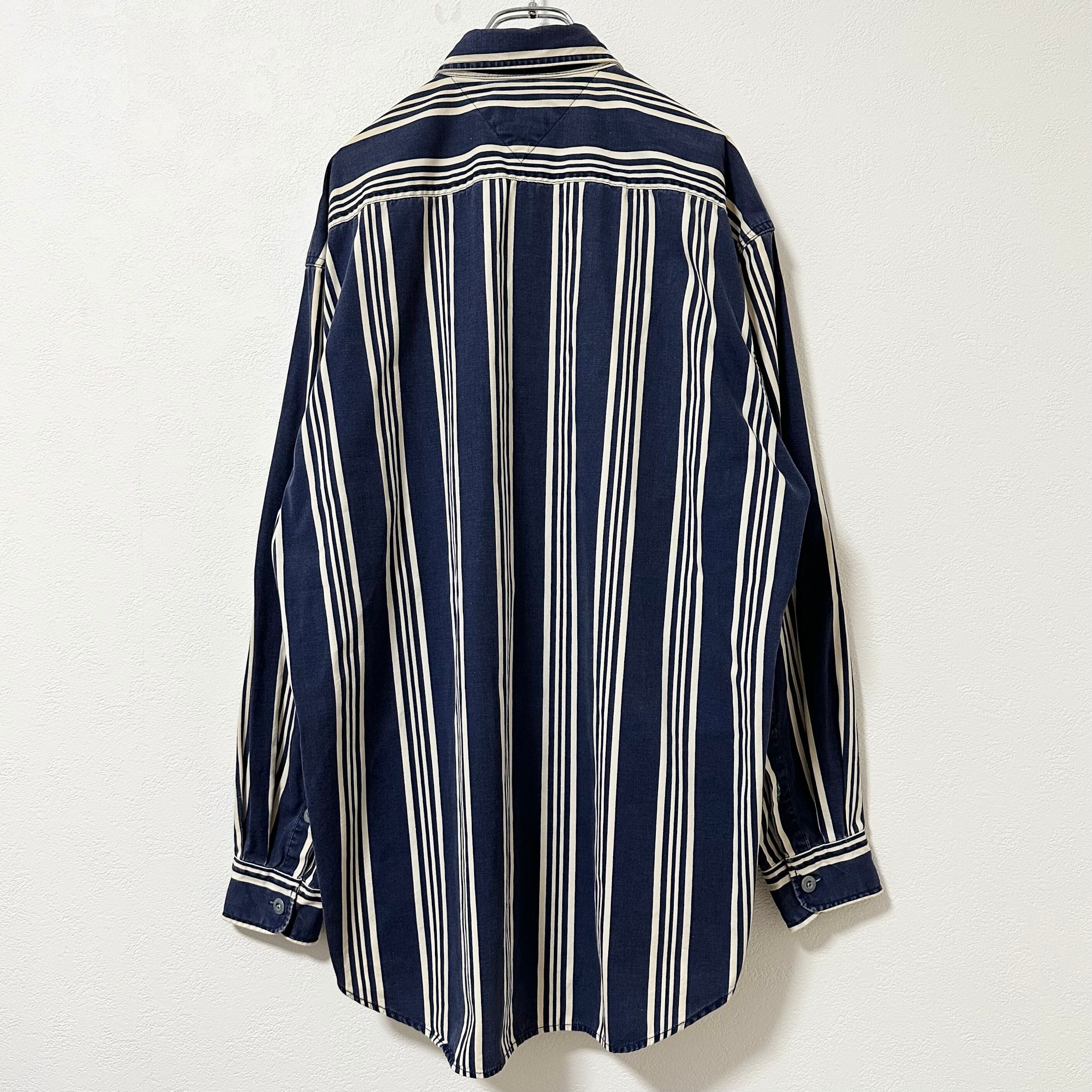 TOMMY HILFIGER/トミーヒルフィガー★80's〜90's★オールドトミー★長袖ストライプシャツ★ネイビー×ホワイト/紺×白★XLサイズ相当