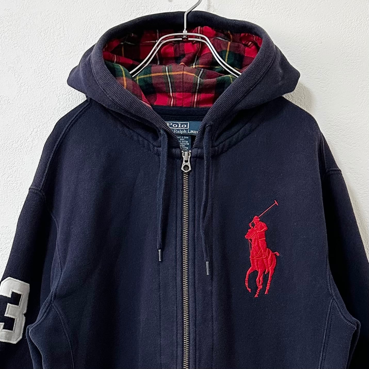 Polo by Ralph Lauren/ポロバイラルフローレン★90's★ジップパーカー★ビッグポニー★ネイビー/紺×赤×チェック★Mサイズ