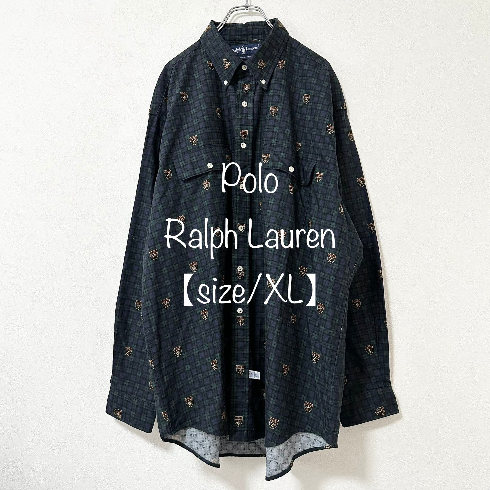 Polo Ralph Lauren★ポロラルフローレン★長袖シャツ★ブラックウォッチチェック★総柄エンブレム★グリーン×ネイビー/緑×紺★XLサイズ