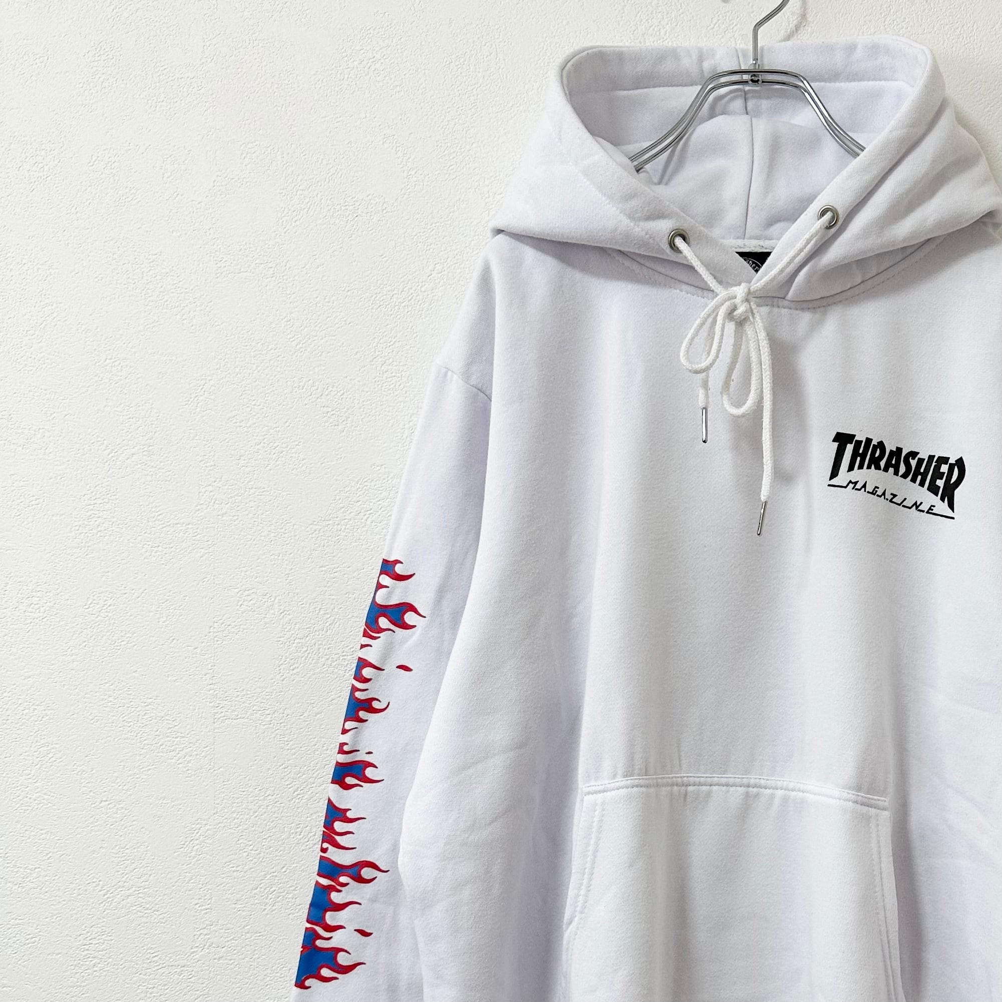 THRASHER/スラッシャー★パーカー★ブルーロゴファイヤーパターン★ホワイト×ブラック×ブルー×レッド/白黒青赤★XL