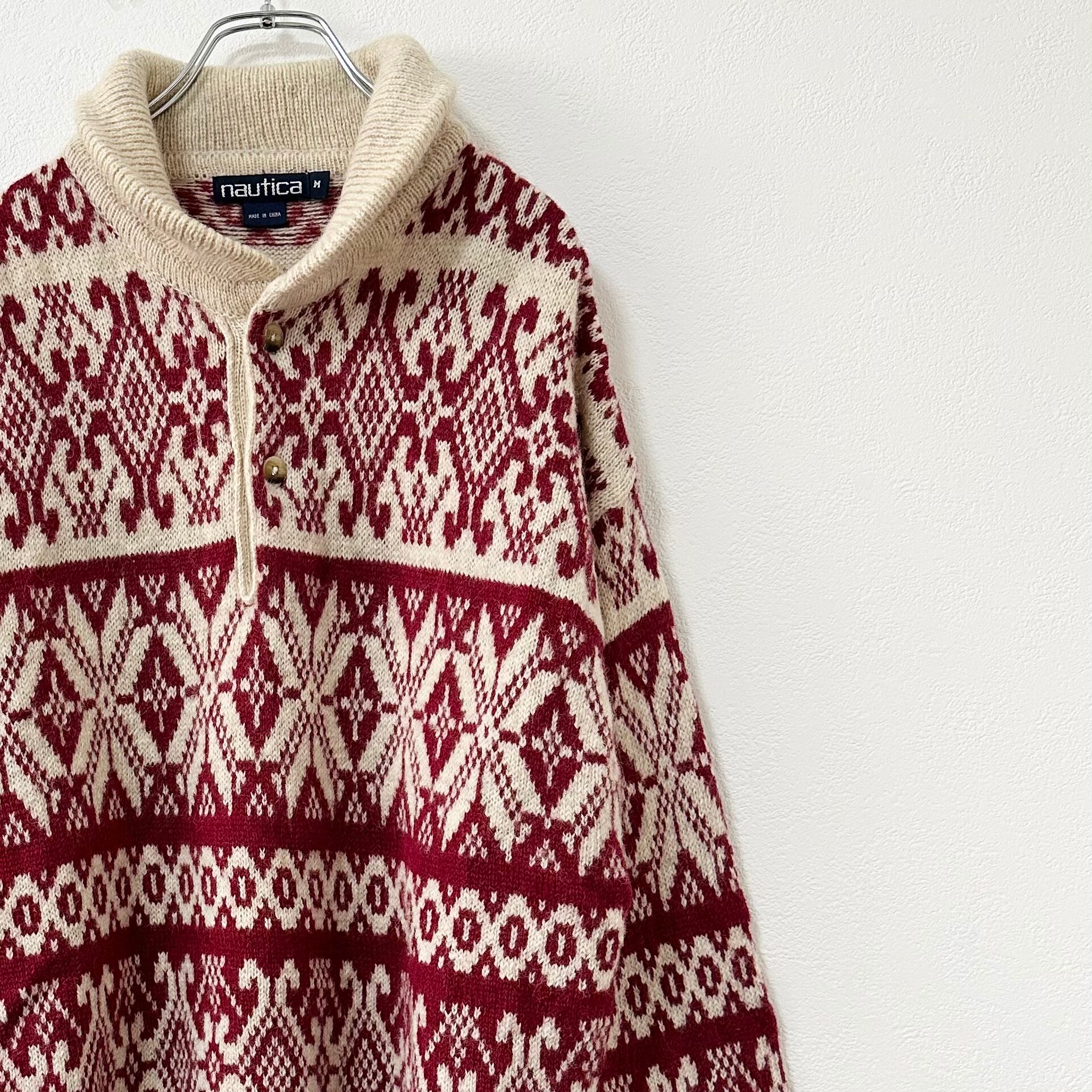 nautica/ノーティカ★80s〜90s★旧タグ★小文字タグ★ノルディック★ニット・セーター★ショールカラー★ハーフボタン★ベージュ・オフホワイト/生成り×レッド/赤 系★ウール100%★M