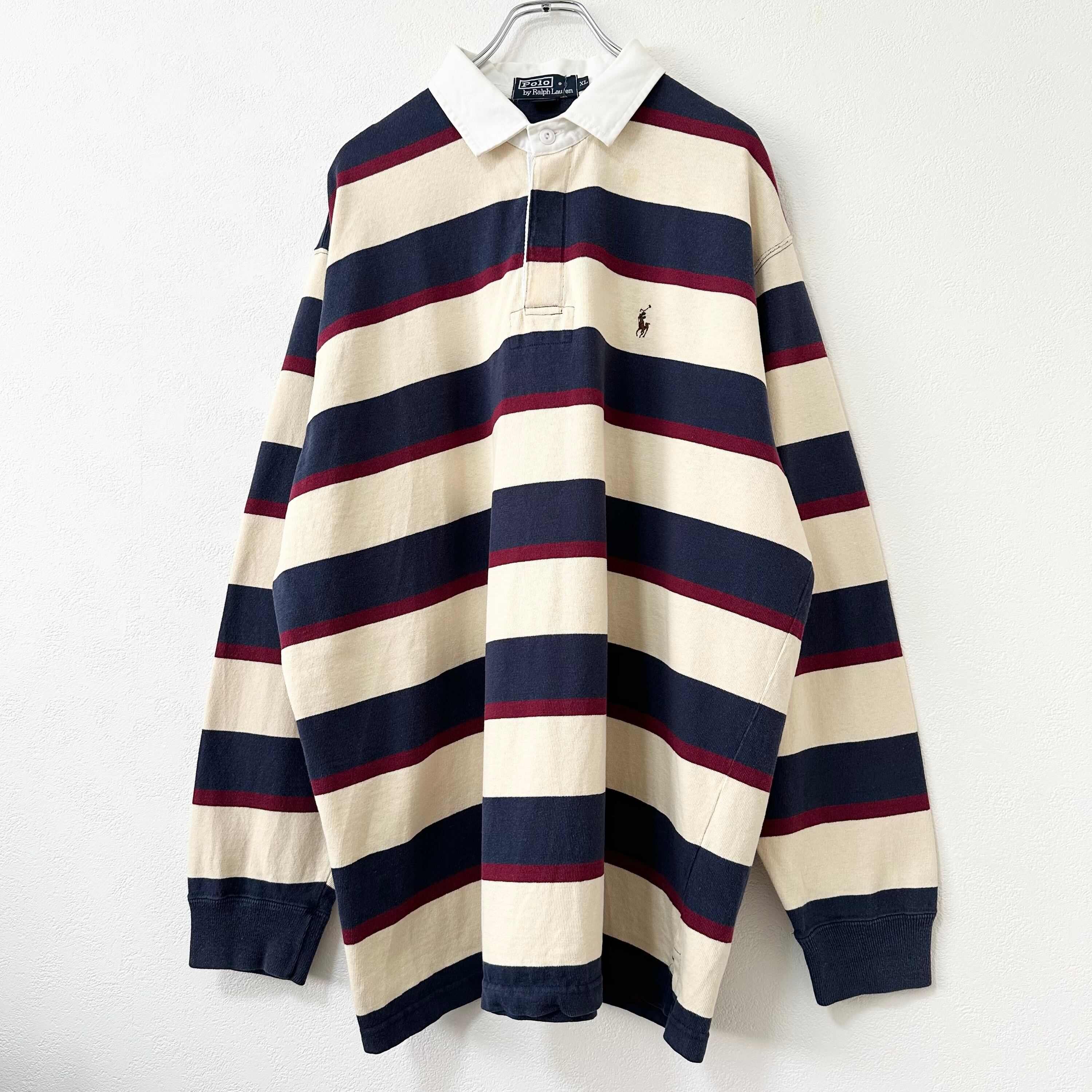 美品★90s★Polo RalphLauren/ラルフローレン★ラガーシャツ★ボーダー★ネイビー/紺×オフホワイト×ワイン系★XL
