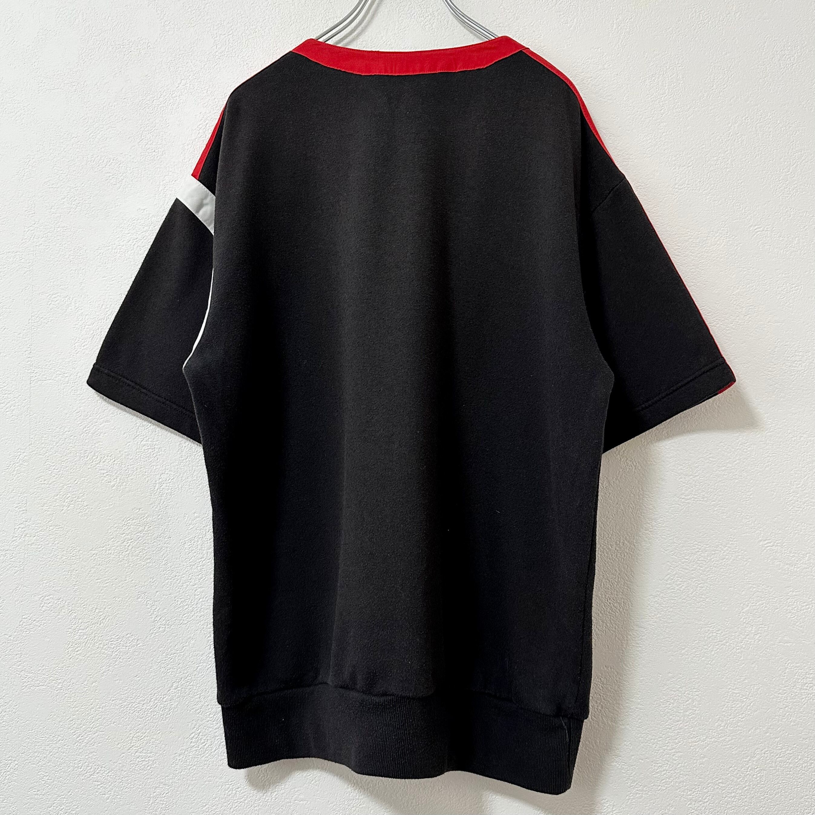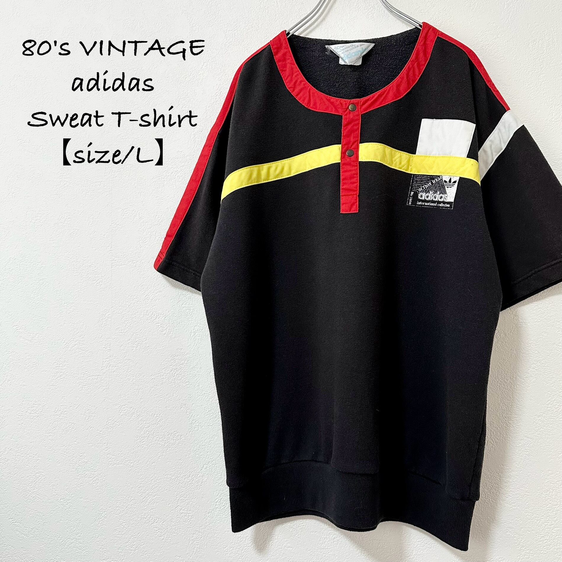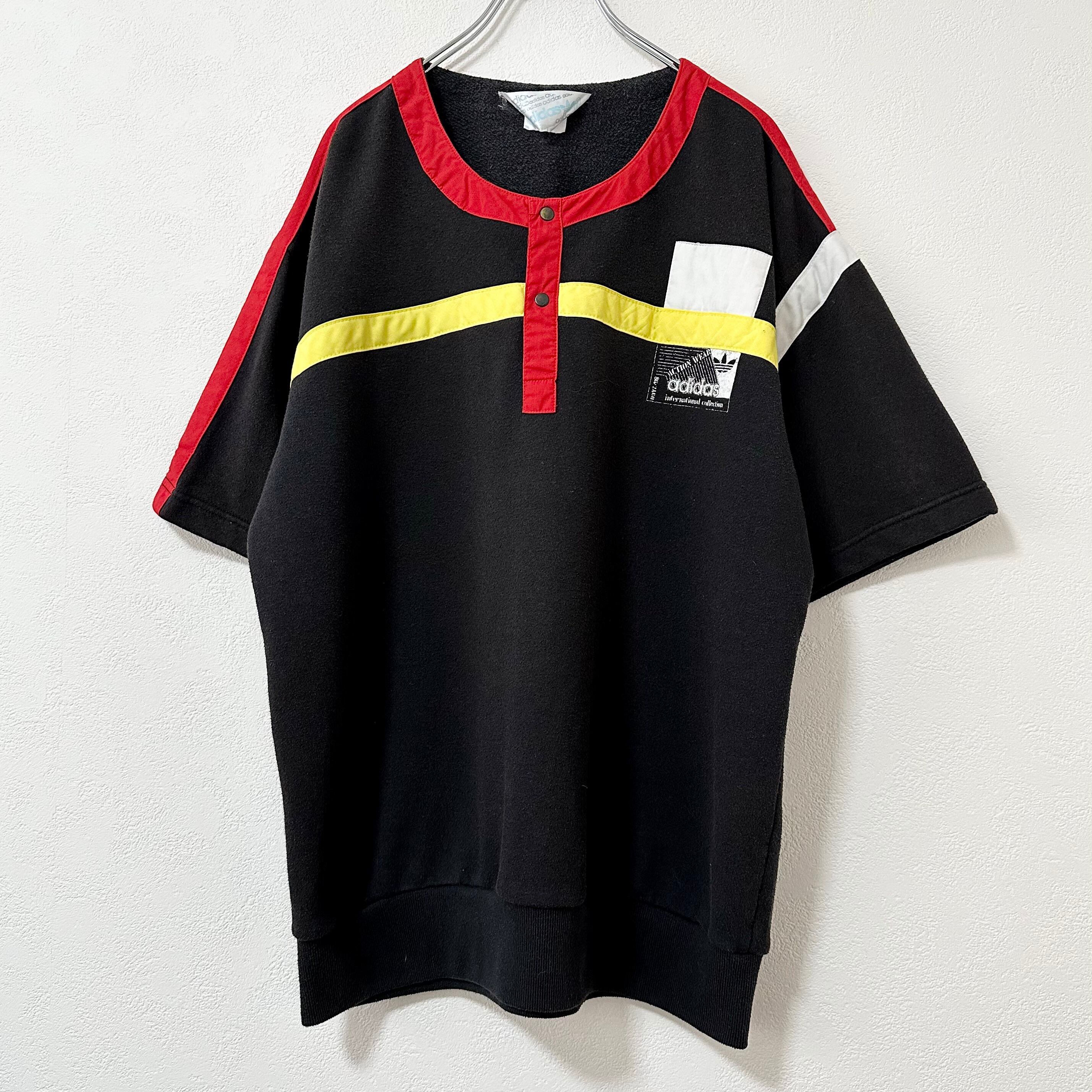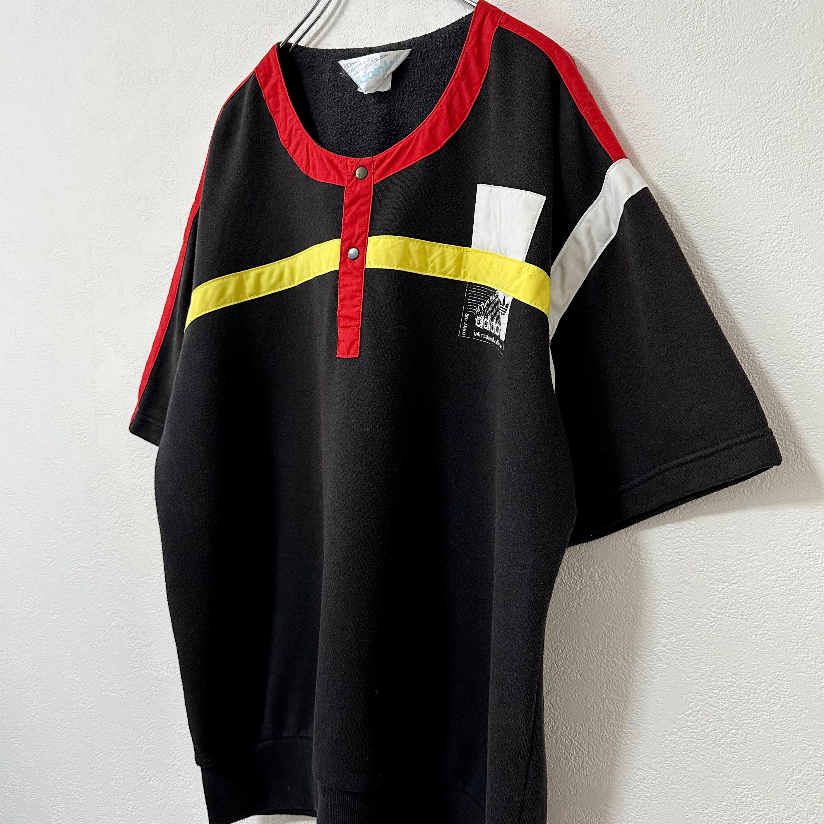 80s★ヴィンテージ★adidas/アディダス★スウェットTシャツ/スウェT★ヘンリーネック★ブラック/黒赤黄白★L