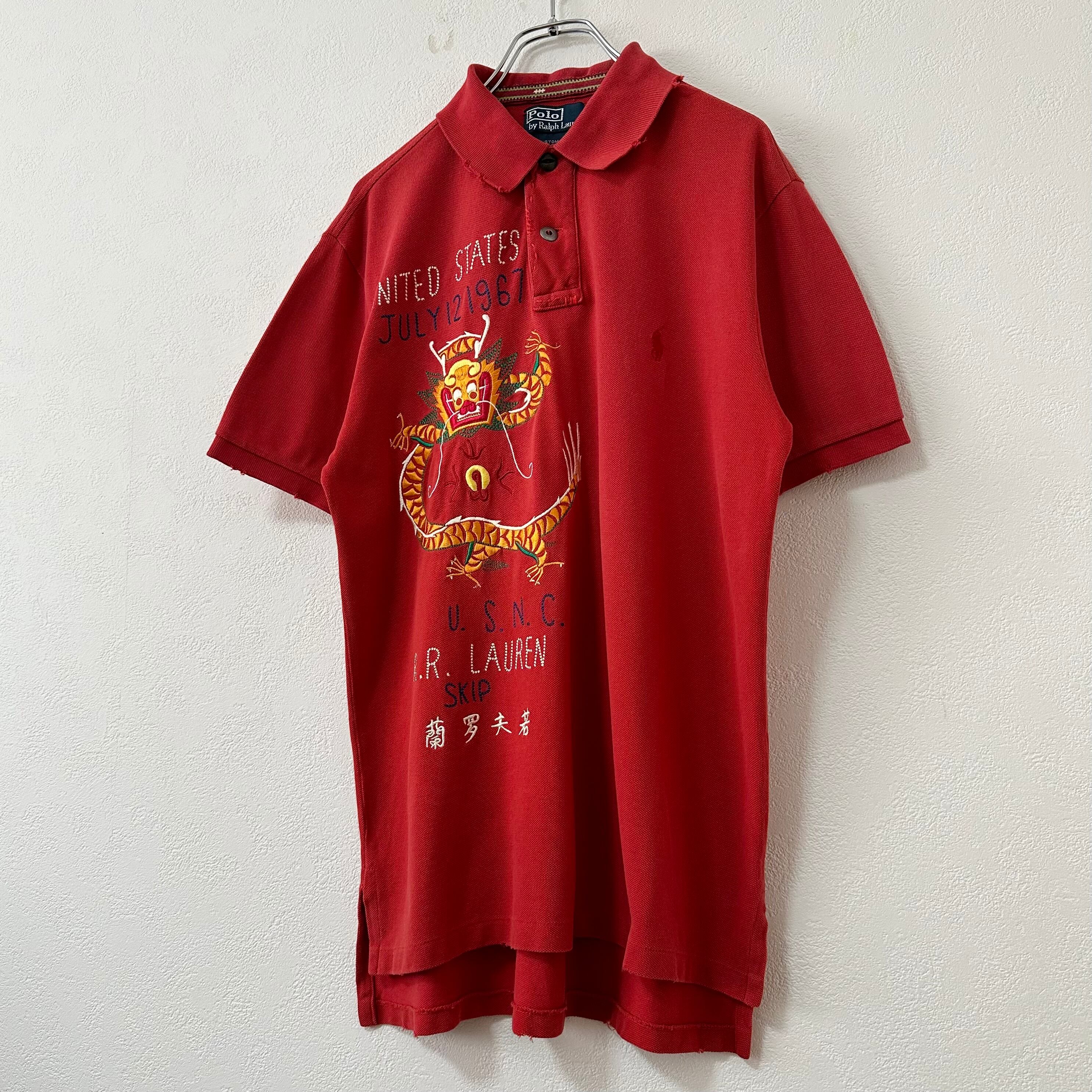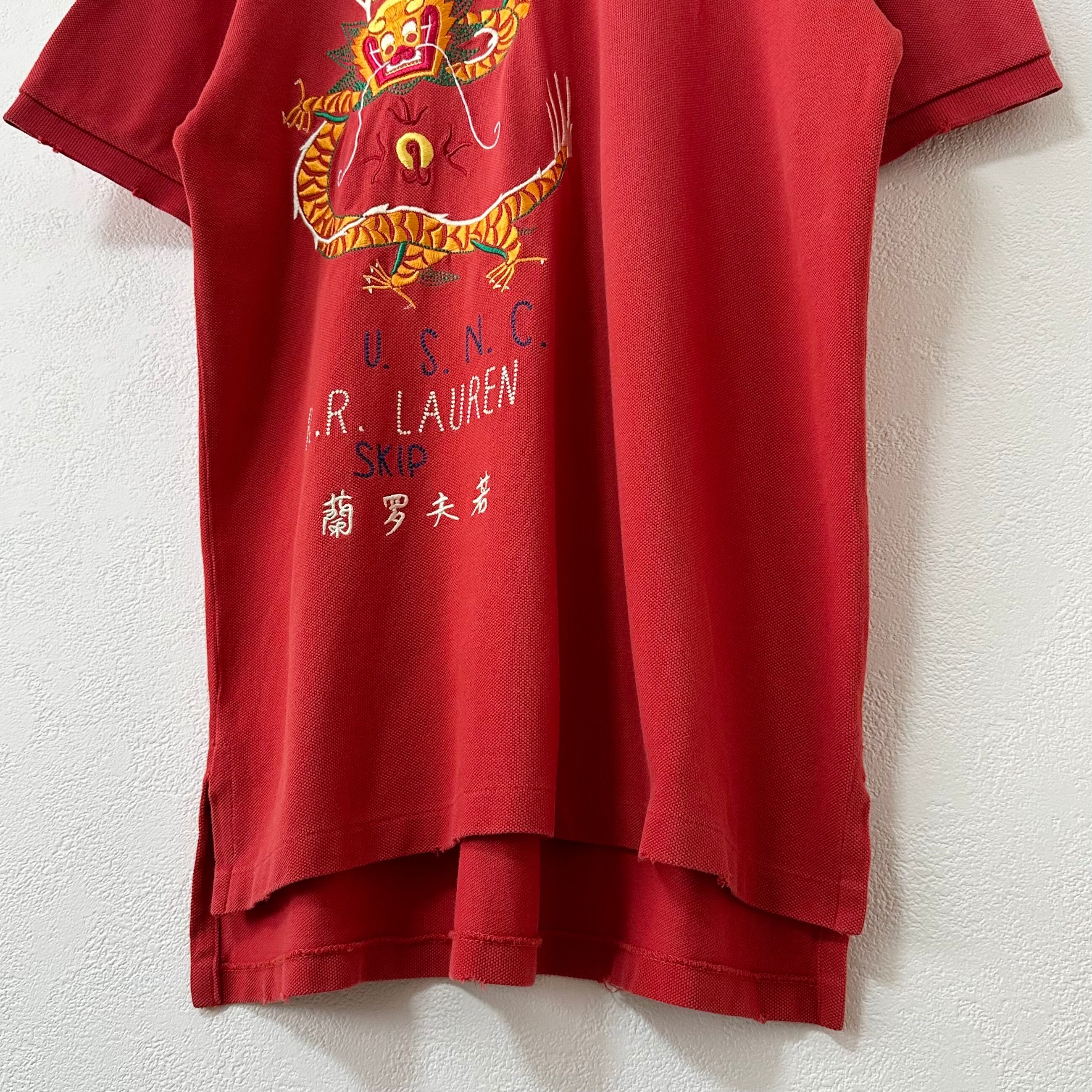 90s★Polo RalphLauren/ポロ ラルフローレン★ポロシャツ★ドラゴン/龍刺繍★ダメージ/クラッシュ加工★レッド/赤★L