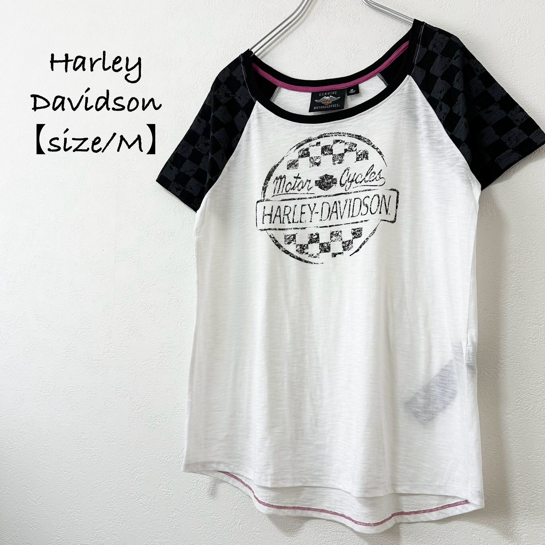 美品★Harley-Davidson★ハーレーダビッドソン★ラグランTシャツ★半袖★チェッカー★ホワイト×ブラック/白黒★M