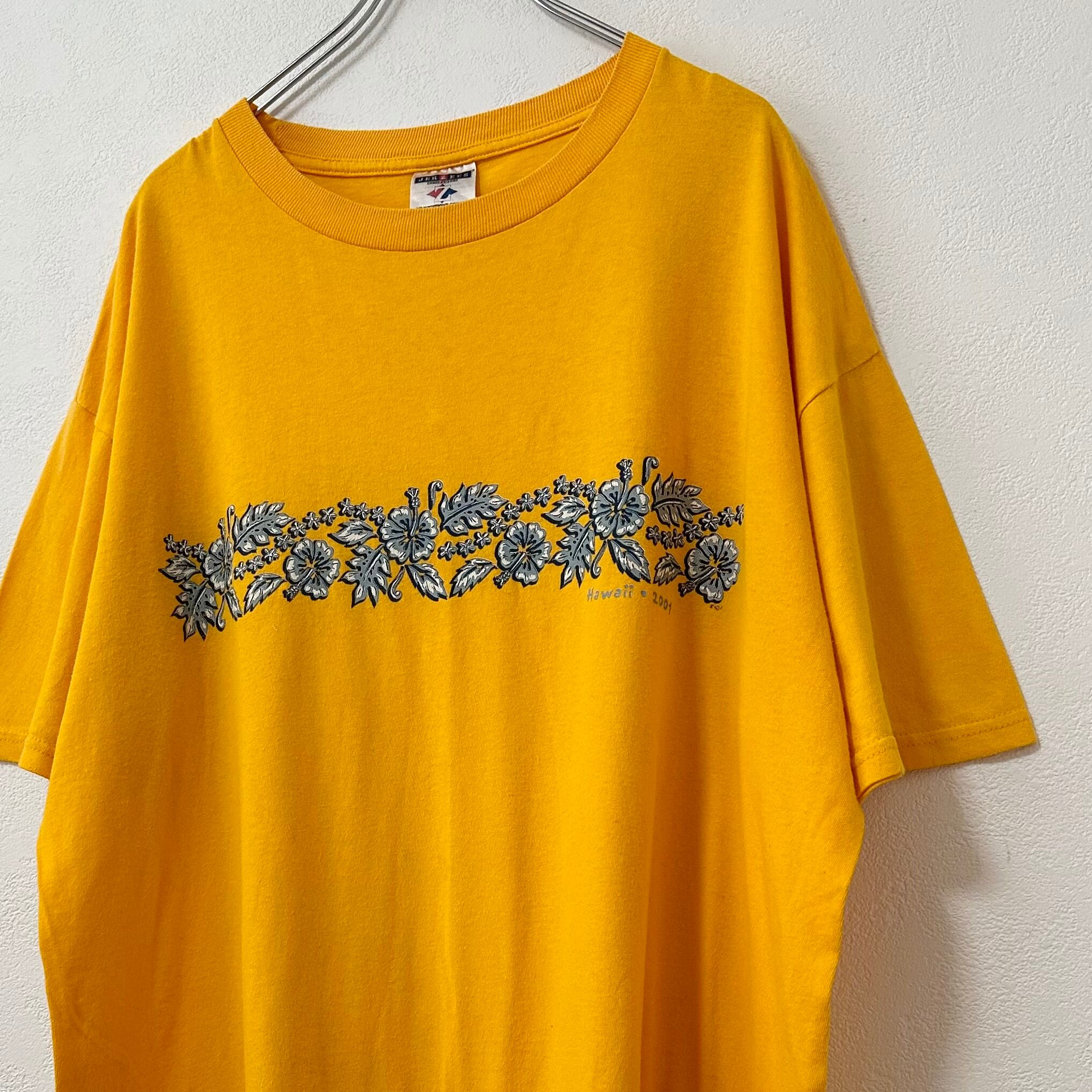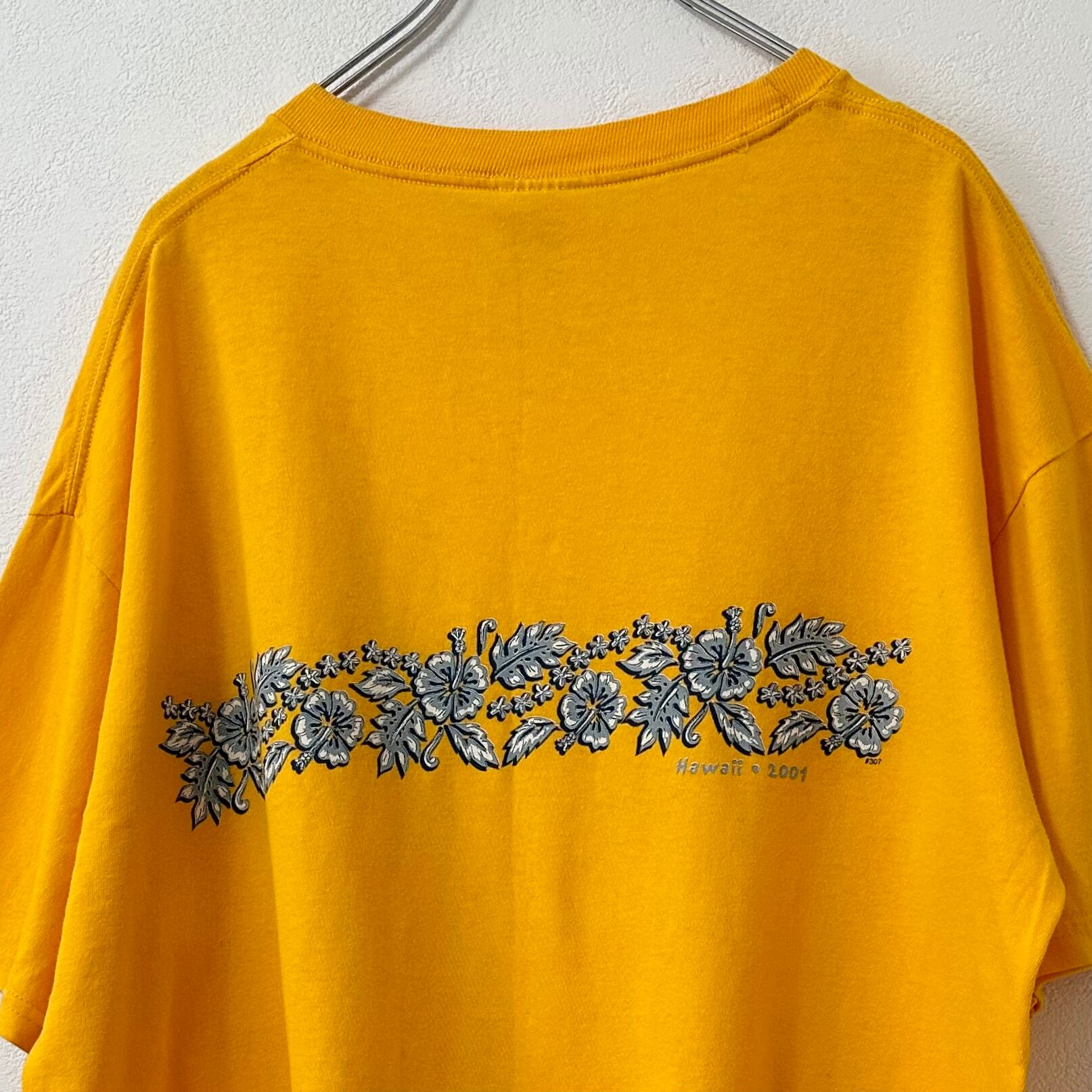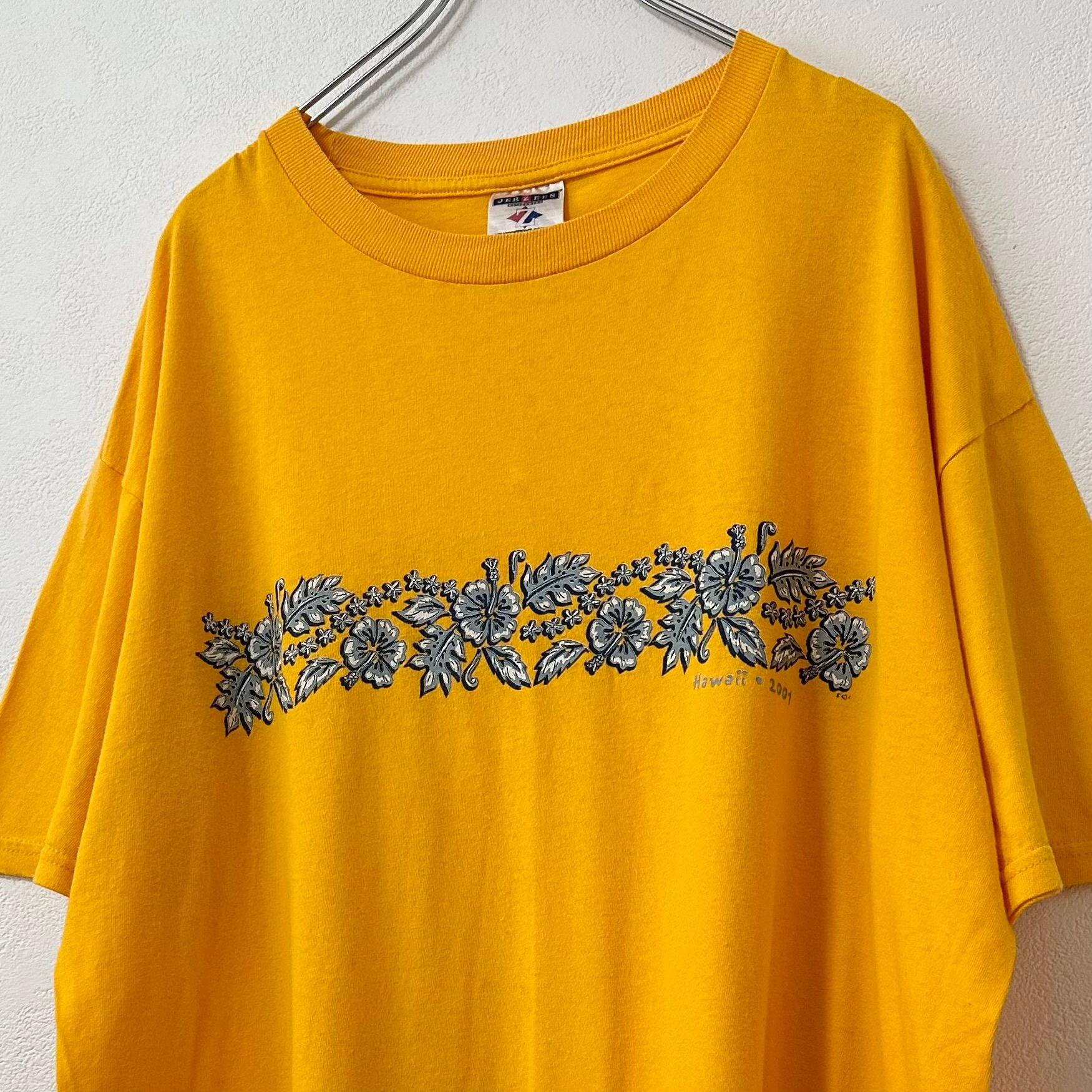 00s★JERZEES/ジャージーズ★半袖Tシャツ★両面ハイビスカス柄★黄★L