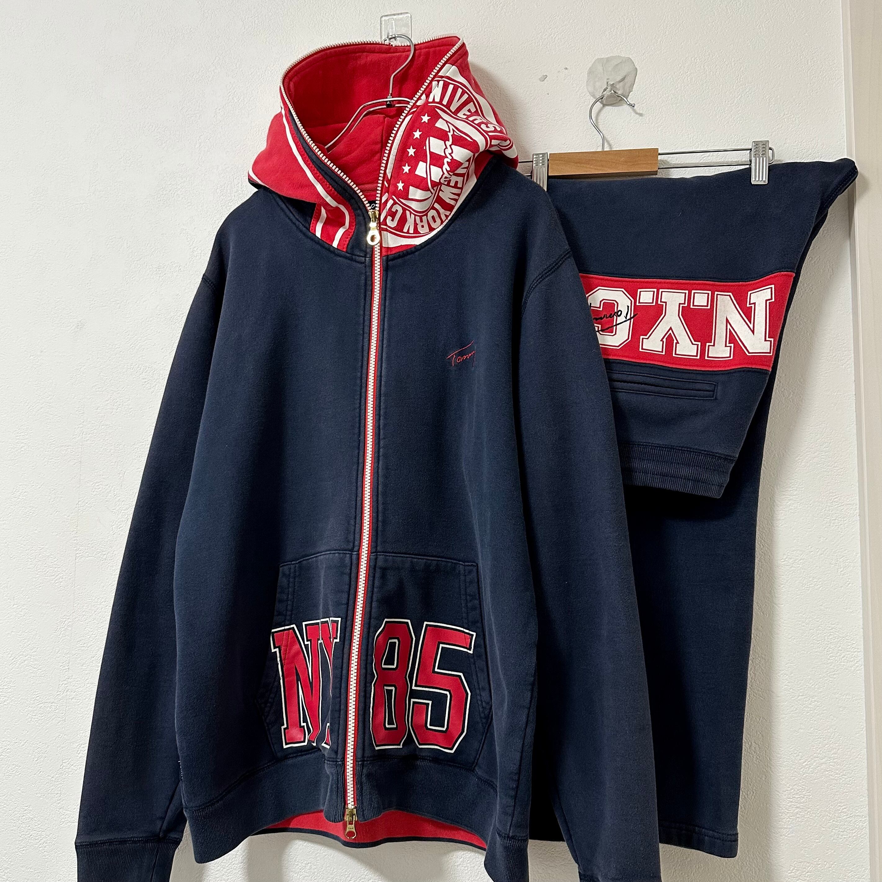 00s★TommyHilfiger/トミーヒルフィガー★スウェットジップパーカー★セットアップ★上下★ネイビー/紺×赤白★XL